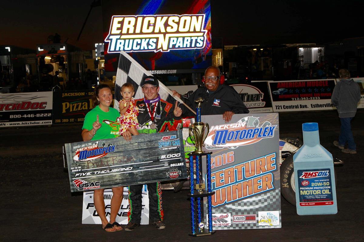 Inside Line Promotions – JACKSON, Minn. (June 23, 2016) – Brady Bacon stood atop the podium after winning the first AMSOIL USAC Sprint Cars event at Jackson Motorplex in approximately 28 years on Thursday during the first night of an action-packed weekend tripleheader.